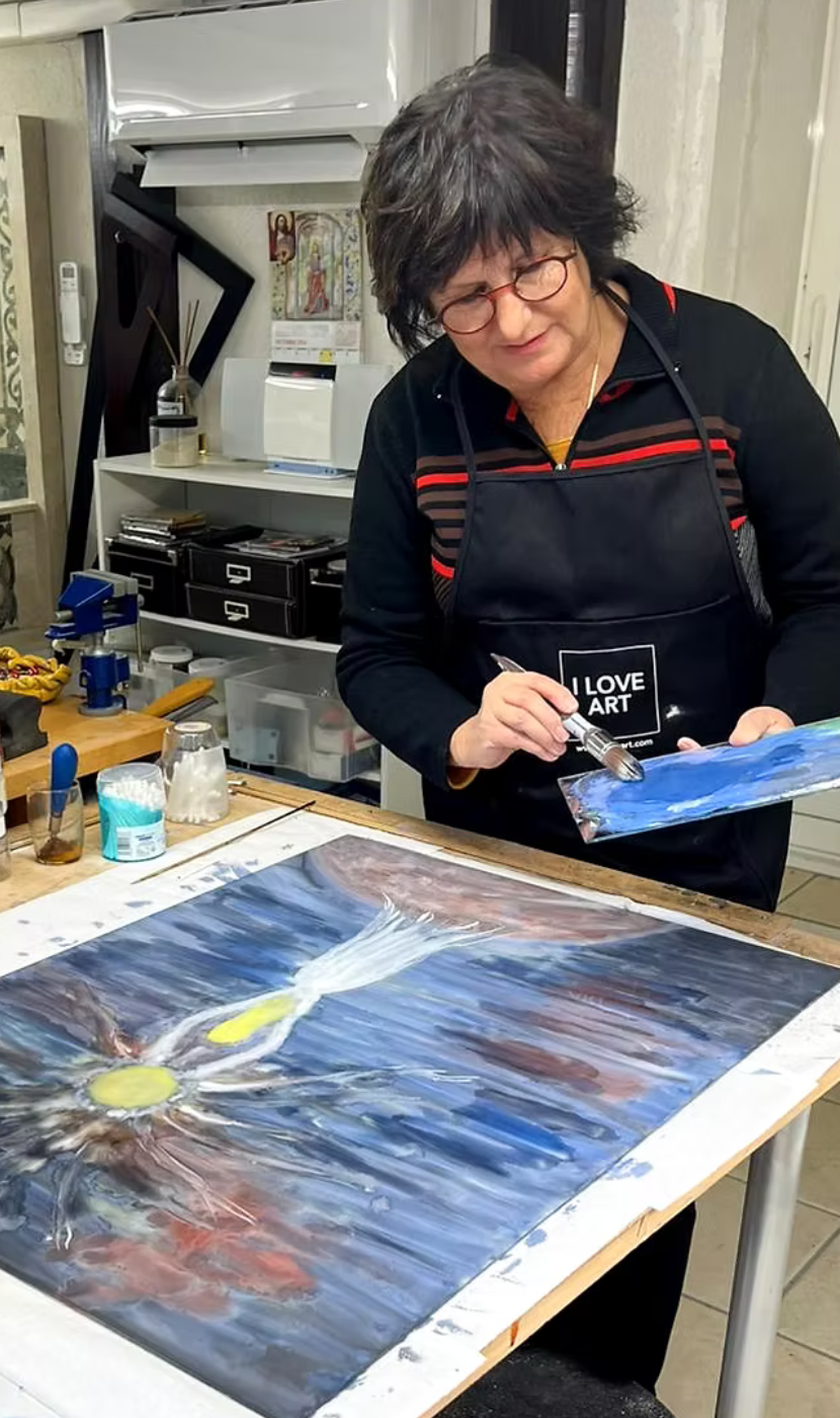 Le verre est un matériau magique, qui demande des compétences techniques mais aussi une sensibilité artistique. Il m’a permis de m’exprimer pleinement tant dans le domaine créatif qu’émotionnel, il sublime mes tableaux et m’ouvre aux autres.
